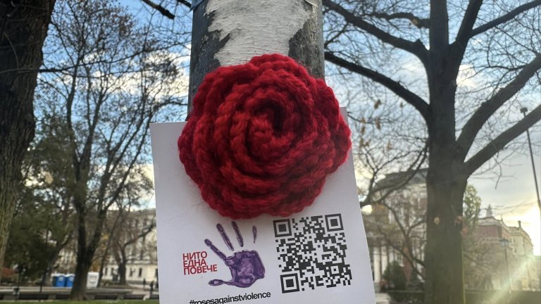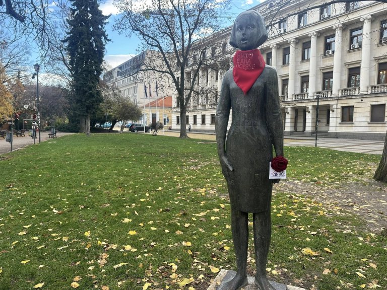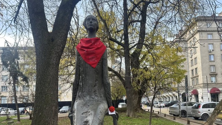 В София статуите на жени осъмнаха с червени шалове с послание - "Нито една повече!".