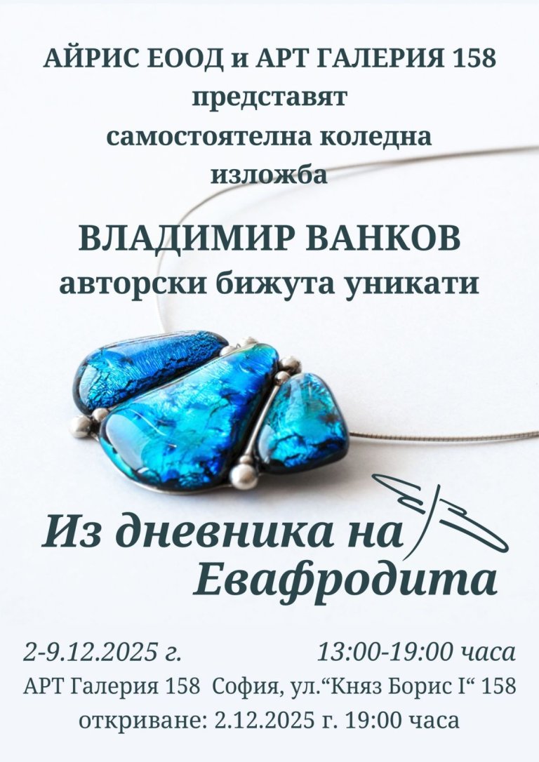 Авторска изложба бижута, озаглавена "Из дневника на Евафродита", ще бъде открита на 2 декември в столичната Art Gallery 158 от 19:00 часа.
