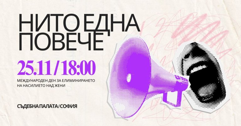 А на 25 ноември в София от 18:00 ч. - Международен ден за елиминиране на насилието срещу жените - в София от 18 часа пред Съдебната палата, ще има протест под наслов "Нито една повече", организиран от Феминистки мобилизации.