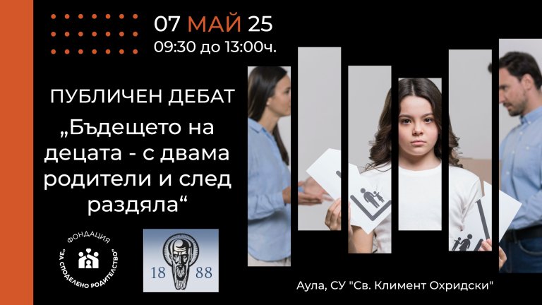 На 7 май 2025 г. (сряда), от 09:30 до 13:00 часа, в Аулата на Софийския университет "Св. Климент Охридски" ще се проведе публичен дебат на тема "Бъдещето на децата - с двама родители и след раздяла", иницииран от Фондация "За споделено родителство".