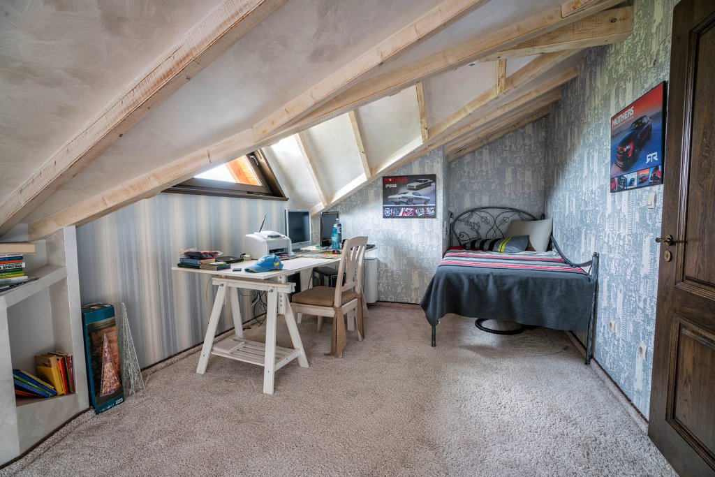 Стените ще бъдат в цветни тапети с рисувани герои. А таванът ще бъде пълен с покривни прозорци, през които ще строи винаги светлина. Дори и вечер, когато единствено звездиците ще блещукат игриво и когато ще можеш да видиш дори преминаващия самолет. А от издадените греди ще висят всякакви планети, звезди и феи от хартия, които ще се полюшват дори и от най-малкото движение на въздуха.