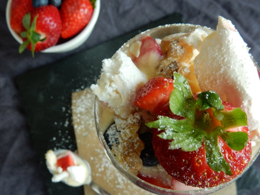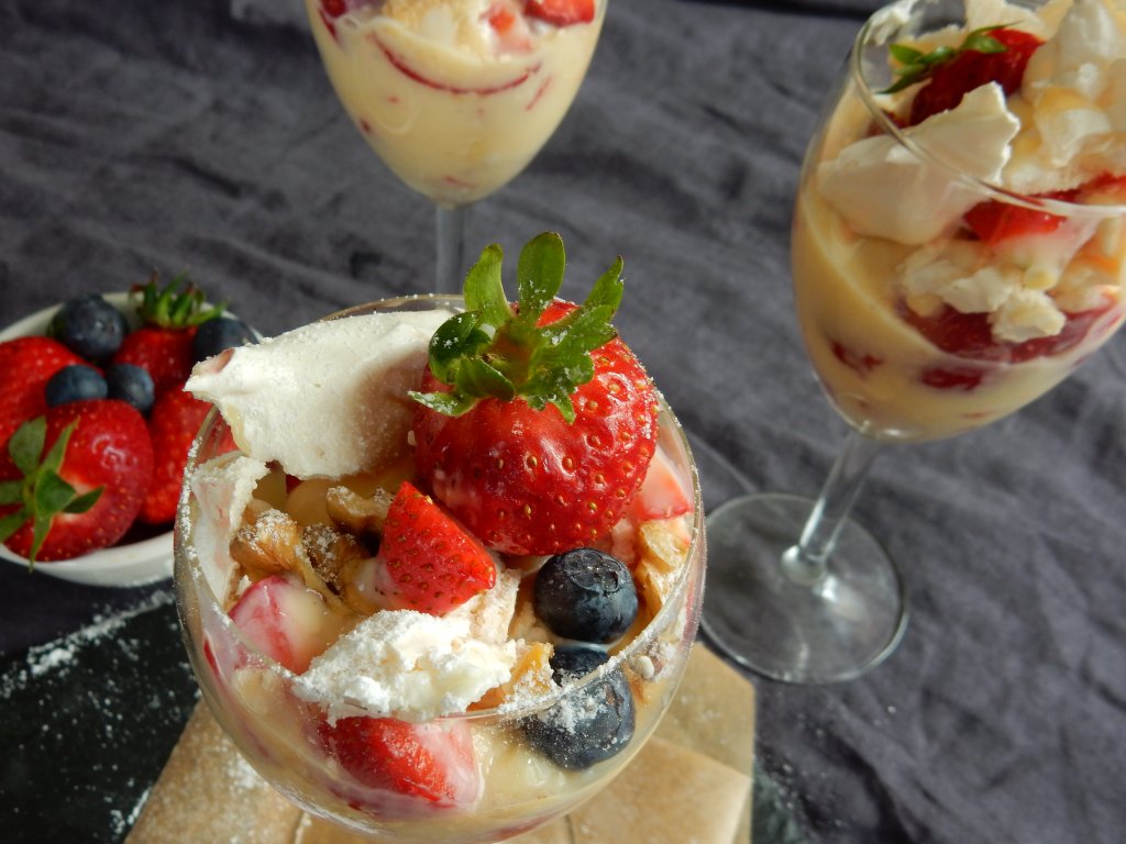 Подредете десерта в чаши като натрошите целувки, върху тях сипете от крема и нарязани ягоди и боровинки. След това добавете още крем и завършете отгоре с целувки, цели ягоди и орехи.
