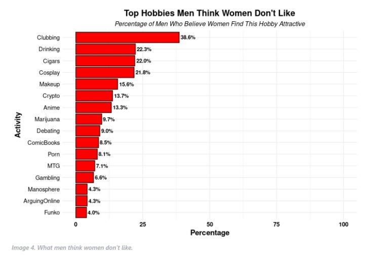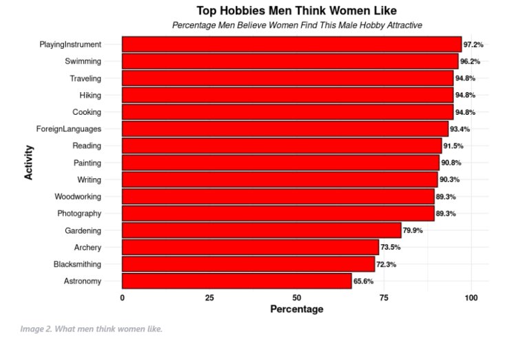 Тенденцията е, че мъжете са подценили привлекателността на някои свои хобита, но и погрешно са сметнали, че атлетичните занимания като плуване, стрелба с лък и катерене по планини са по-харесвани от жените, отколкото е в действителност.